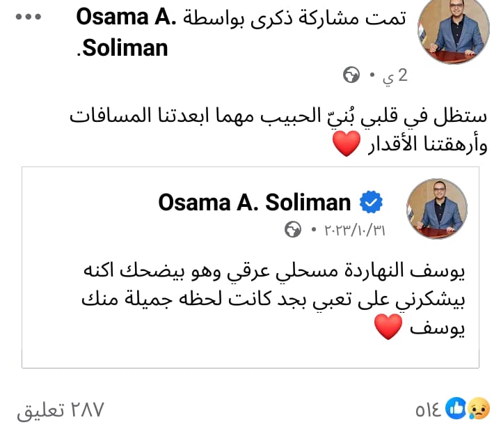 وكان الفقيد قد نشر قبل رحيله بيوم منشورًا بسيطًا عبّر فيه عن حبه لابنه دون أن يدري أنه يودّعه بكلماته الأخيرة، قائلًا: ستظل في قلبي بُني الحبيب مهما ابعدتنا المسافات وأرهقتنا الأقدار". لتتحول هذه الكلمات الآن إلى رسالة موجعة تلامس قلوب الجميع.