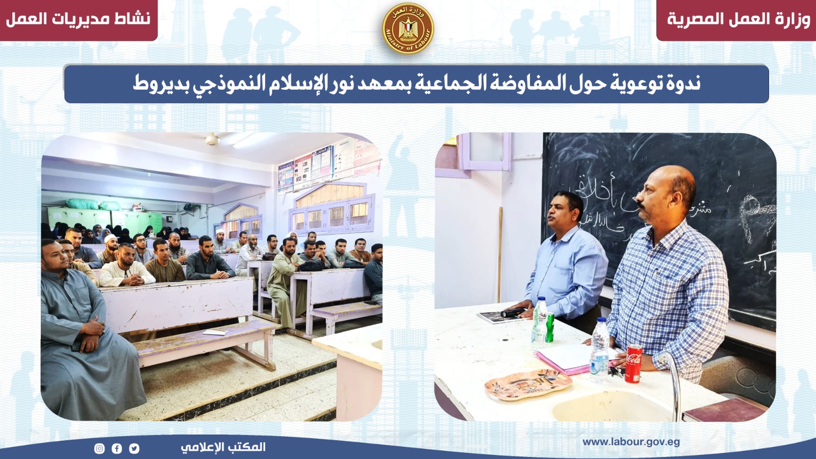 نظّم مكتب علاقات عمل ديروط بمديرية العمل بأسيوط ندوة توعوية في مجال المفاوضة الجماعية بمعهد نور الإسلام النموذجي الأزهري الخاص بديروط، تنفيذًا لتوجيهات الوزير محمد جبران وزير العمل، وتعليمات الدكتور حازم علي حسن مدير مديرية العمل بأسيوط، وفي إطار حرص الوزارة على نشر ثقافة الحوار الاجتماعي وتعزيز بيئة عمل مستقرة.