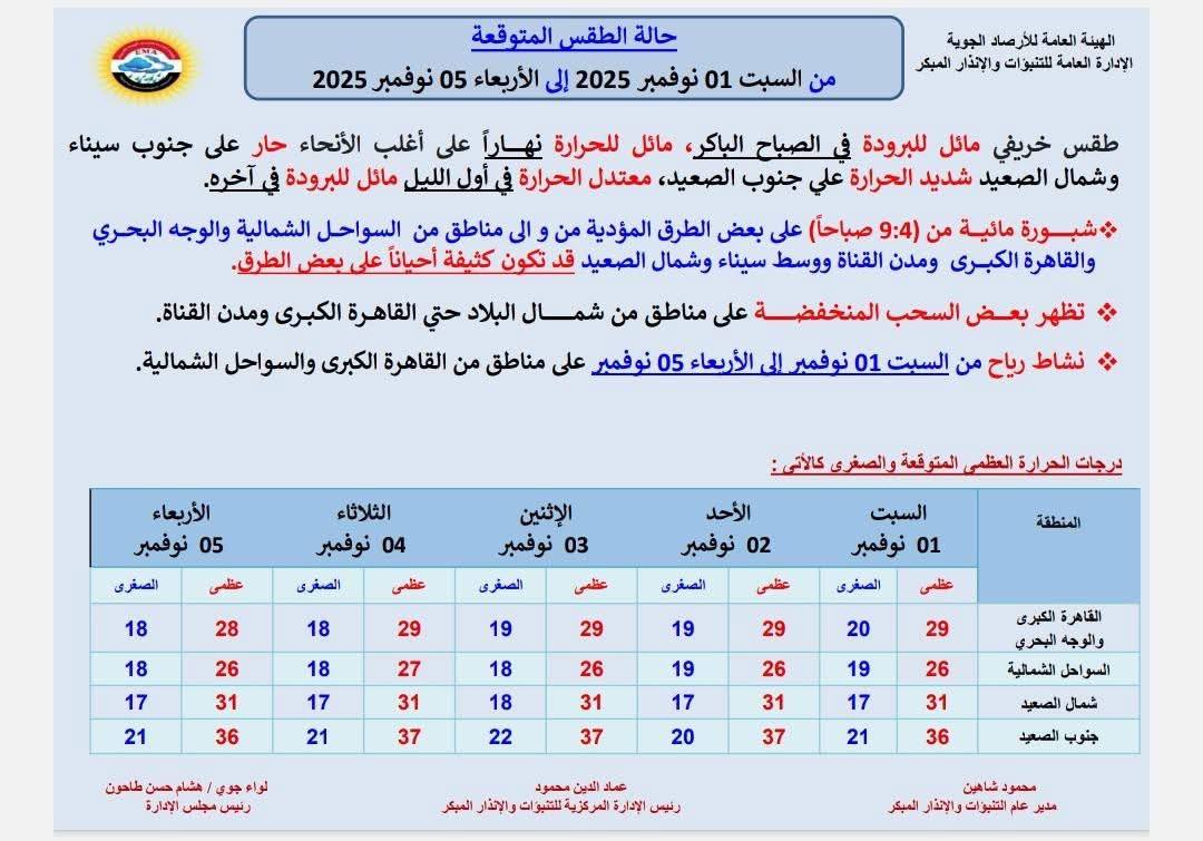حالة الطقس غدًا الأربعاء 5 نوفمبر 2025… تشهد محافظات الجمهورية غدًا الأربعاء الموافق 5 نوفمبر 2025، أجواءً خريفية مائلة للبرودة في الصباح الباكر، مع طقس مائل للحرارة نهارًا على أغلب الأنحاء وحار على جنوب سيناء وشمال الصعيد، بينما يكون شديد الحرارة على جنوب الصعيد، ويعتدل الطقس في أول الليل ويميل للبرودة في آخره.