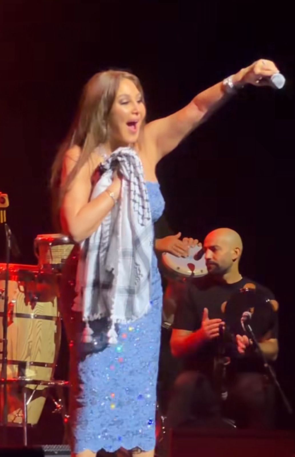 وأشعلت هذه اللقطة بمواقع التواصل الاجتماعي وهي تتفاعل مع الجمهور أثناء غنائها لأغنيتها المعروفة "فاكر"، ولفتت الأنظار بلفتة إنسانية مميزة عندما ارتدت شالًا فلسطينيًا أثناء الحفل، في إشارة رمزية لدعمها للشعب الفلسطيني وأهالي غزة.