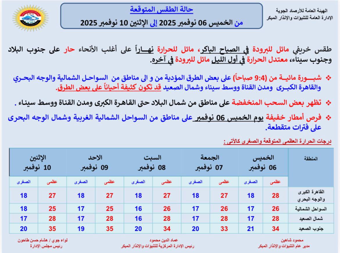 وفيما يلي بيان درجات الحرارة العظمى والصغرى من الخميس 06 نوفمبر وحتى الإثنين 10 نوفمبر: