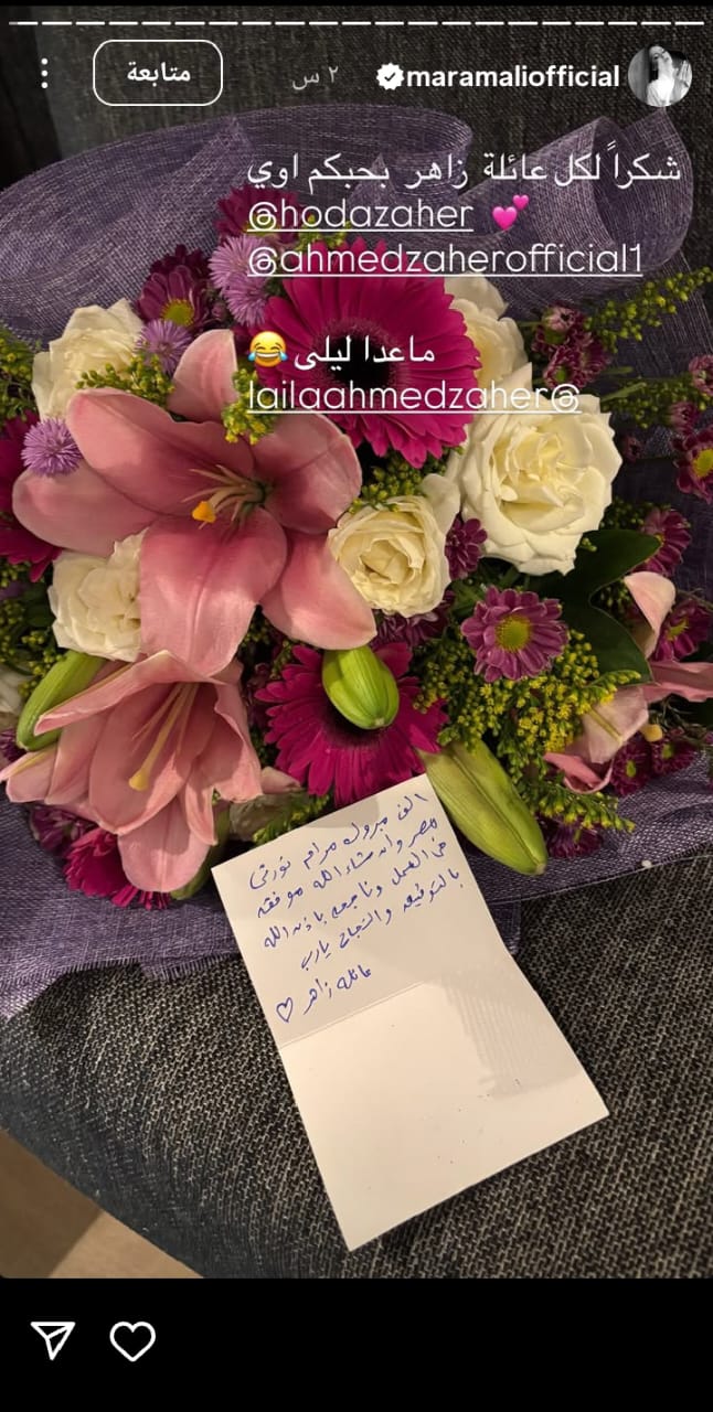 ونشرت الفنانة مرام علي عبر صفحتها الشخصية بموقع تبادل الصور والفيديوهات القصيرة"انسجرام"، صورة للبوكيه مُعلقة : “شكرا لكل عائلة زاهر بحبكم أوي ماعدا ليلى”.