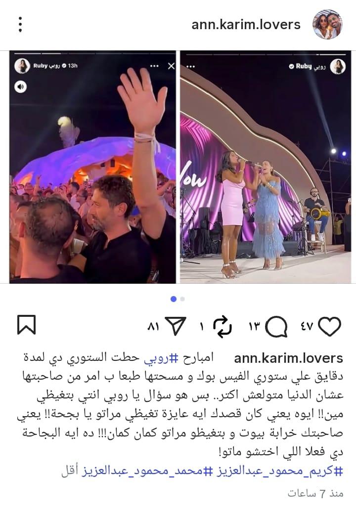 ووجهت صفحة محبي كريم محمود عبدالعزيز رسالة هجوم قوية للفنانتين روبي ودينا قائلة: امبارح روبي حطت الستوري دي خلال دقائق ومسحتها وأكيد بأمر من صاحبتها عشان الدنيا متولعش، عايزين يغيظوا مراته".