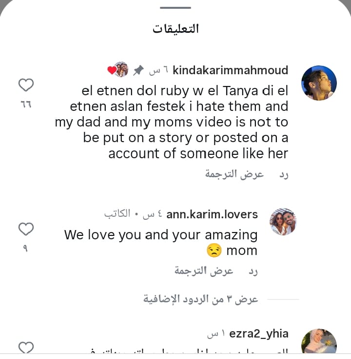 وعلقت كندا ابنة الفنان كريم محمود عبدالعزيز على هذا المنشور قائلة: الاثنين دول روبي والتانية دي فستك أنا بكرههم وفيديو بابا وماما مينفعش تتجاب سيرتهم فى ستوريهات أو على أكونت حد زيهم".
