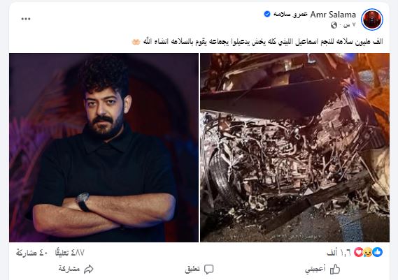كما دعا له المخرج عمرو سلامة بالشفاء العاجل عبر حسابه الرسمي "فيس بوك" قائلا" الف مليون سلامه للنجم اسماعيل الليثى كله يخش يدعيلوا يجماعه يقوم بالسلامه ان شاء الله".