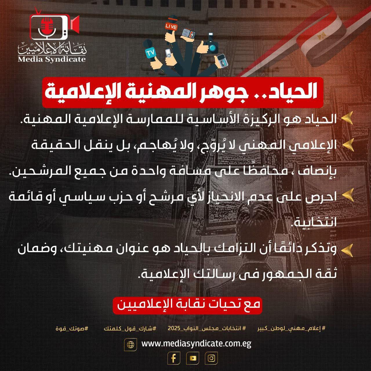 ويأتي ذلك تزامنًا مع انطلاق انتخابات مجلس النواب 2025، وفي إطار حملة نقابة الإعلاميين بعنوان “إعلام مهني لوطن كبير.