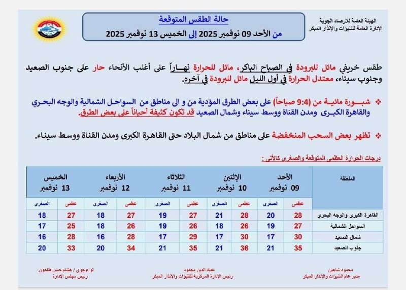 درجات الحرارة المتوقعة خلال الفترة من 9 إلى 13 نوفمبر