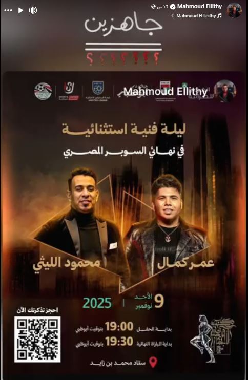 جاهزين..محمود الليثي يروج لحفل نهائي السوبر المصري بالامارات (صورة)