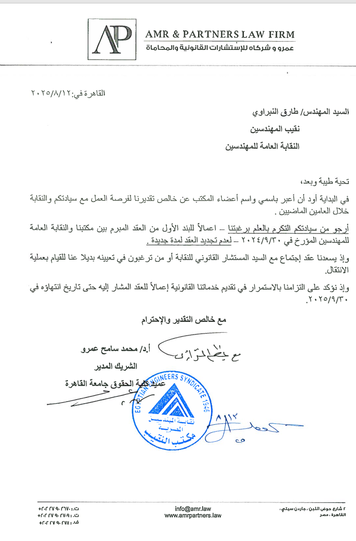 وأكد المكتب أن هذا الإجراء لم يتم بواسطة المكتب نفسه، بل بواسطة الإدارة القانونية للنقابة، وأن وصفه بأنه "اجتهاد غير موفق" لا يعكس الحقيقة القانونية، موضحًا أن انتهاء العلاقة التعاقدية بينه وبين النقابة لم يكن بناء على قرار من النقابة، بل بمبادرة من المكتب نفسه، حيث أبلغ النقيب رسميًا في 12 أغسطس 2025 بعدم رغبته في تجديد العقد، وتم استلام الخطاب بتاريخ 13 أغسطس 2025.