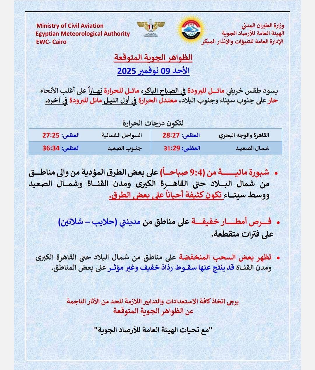 ونصحت الهيئة العامة للأرصاد المواطنين بضرورة متابعة النشرات الجوية بشكل دوري لمعرفة تفاصيل حالة الطقس، واتخاذ جميع الاحتياطات اللازمة أثناء القيادة في الصباح، وارتداء ملابس مناسبة لتقلب درجات الحرارة خلال غدًا.