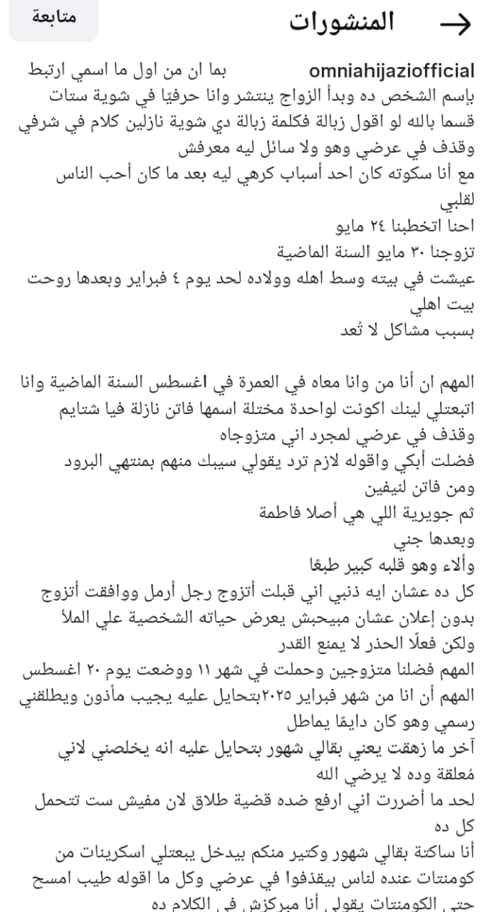 وتابعت: “المهم إن أنا من وأنا معاه في العمرة في اغسطس السنة الماضية، وأنا اتبعتلي لينك أكونت لواحدة مختلة اسمها فاتن نازلة فيا شتايم وقذف في عرضي لمجرد إني متزوجاه”.