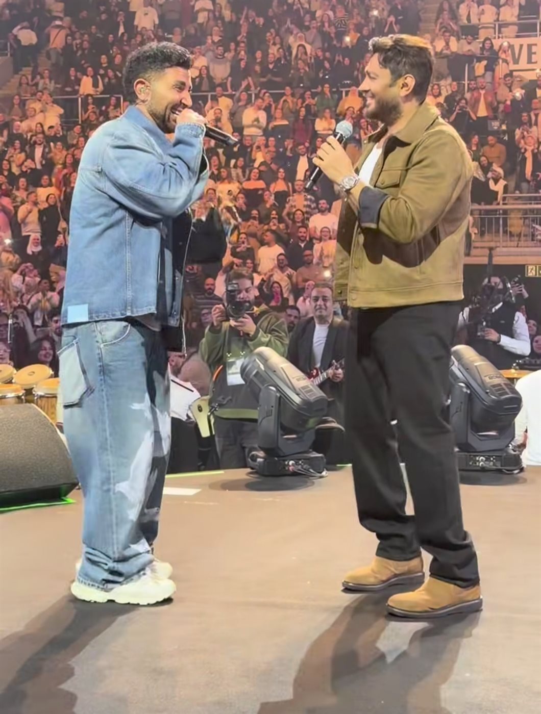 وتبادلا النجمان الاغاني، حيث قدما سويًأ حلو المكان لـ تامر حسني وايه اليوم الحلو ده لـ أحمد سعد، وسط تفاعل جماهيري واسع.