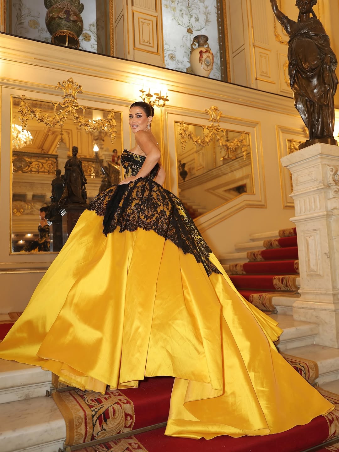 وجاء الجزء العلوي من الفستان مصنوعًا من الدانتيل الأسود الفاخر على شكل زخارف أنيقة، مع ياقة على شكل قلب (كورسيه) أبرزت جمال قوامها برقي، أما الجزء السفلي فكان واسعًا ومنفوشًا بطبقات من القماش اللامع باللون الأصفر الزاهي، مما منح الإطلالة طابعًا ملكيًا متكاملًا يليق بأجواء الحفل الفخم.