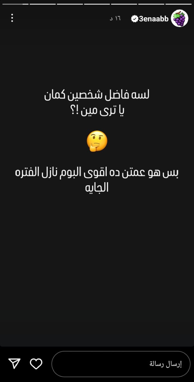 ونشر ستوري أخر قائلًا: "لسة فاضل شخصين كمان، ياترى مين؟، بس هو عاماً دة أقوى ألبوم نازل الفترة دي".
