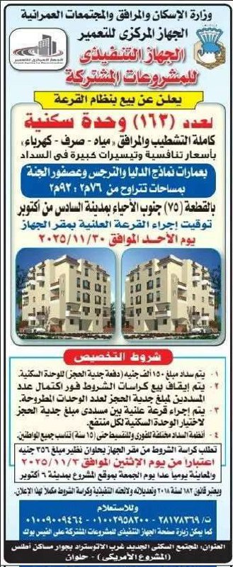 وزارة الإسكان تطرح 163 وحدة سكنية كاملة التشطيب… طرحت وزارة الإسكان والمرافق والمجتمعات العمرانية، ممثلة في الجهاز التنفيذي للمشروعات المشتركة، عدد 163 وحدة سكنية جديدة كاملة التشطيب والمرافق بمدينة السادس من أكتوبر وذلك للبيع بنظام القرعة العلنية، في إطار جهود الدولة لتوفير وحدات سكنية بأسعار مناسبة وتسهيلات في السداد.
