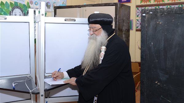 أدلي الانبا تكلا مطران دشنا وتوابعها بصوته في الانتخابات البرلمانية ومرافقه وفد من قساوسة الكنيسة بمدينة دشنا شمال قنا .