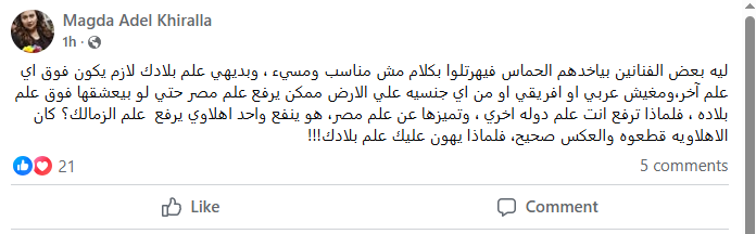 وعلقت ماجدة خيرالله على هذه الواقعة عبر صفحتها الشخصية"فيسبوك"، قائلًا: "ليه بعض الفنانين بياخدهم الحماس فيهرتلوا بكلام مش مناسب ومسيء ، وبديهي علم بلادك لازم يكون فوق اي علم آخر،ومغيش عربي او افريقي او من اي جنسيه علي الارض ممكن يرفع علم مصر حتي لو بيعشقها فوق علم بلاده ، فلماذا ترفع انت علم دوله اخري ، وتميزها عن علم مصر، هو ينفع واحد اهلاوي يرفع علم الزمالك؟ كان الاهلاويه قطعوه والعكس صحيح، فلماذا يهون عليك علم بلادك!!!".