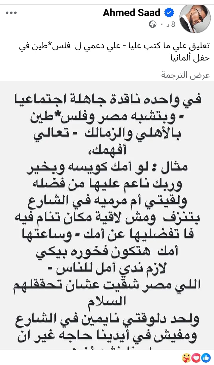 وعلق أحمد سعد على هذا الهجوم عبر صفحته الشخصية "فيسبوك"، قائلًا تعليقي على ما كتب عني على دعمي لفلسطين في حفل ألمانيا : في واحدة ناقدة جاهلة إجتماعيًا، وبتشبه مصر وفلسطين بالأهلي والزمالك".