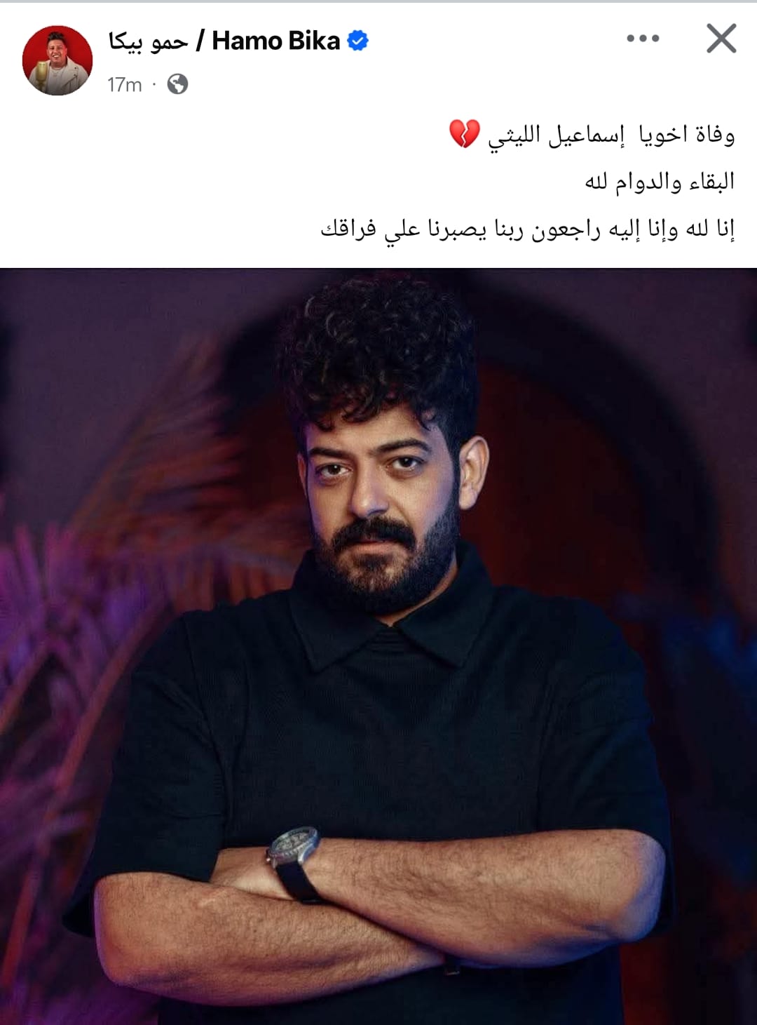 وكتب حمو بيكا عبر حسابه الرسمي "فيس بوك" “ وفاة اخويا اسماعيل الليثي البقاء والدوام لله ان لله وان اليه راجعون ربنا يصبرنا علي فراقك”.