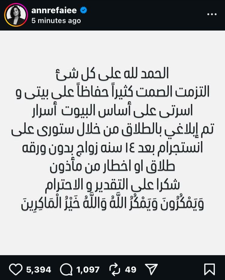 ونشرت آن رفاعي، منشور مفاجئ عبر حسابها على موقع«إنستجرام»، قائلة: «الحمد لله على كل شيء. التزمت الصمت كثيرًا حفاظًا على بيتي وأسرتي، على أساس أن البيوت أسرار تم توثيق طلاقي عبر ستوري على إنستجرام بعد 14 سنة زواج، دون ورقة طلاق أو إخطار من مأذون.. وشكرًا على التقدير والاحترام، وَيَمْكُرُونَ وَيَمْكُرُ اللَّهُ وَاللَّهُ خَيْرُ الْمَاكِرِينَ».