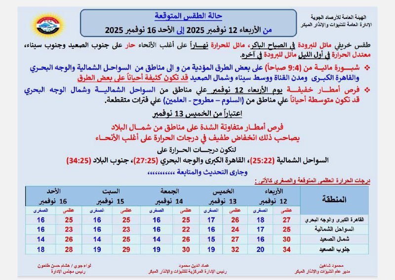 حالة الطقس غداً الأربعاء 12 نوفمبر.. شهدت الهيئة العامة للأرصاد الجوية إصدار بيان تفصيلي حول حالة الطقس المتوقعة بداية من يوم الأربعاء الموافق 12 نوفمبر 2025 وحتى يوم الأحد 16 نوفمبر 2025 وتواصل البلاد خلال هذه الفترة التأثر بأجواء خريفية متقلبة تتسم بالاعتدال نهارًا والبرودة النسبيّة ليلًا، مع فرص لتكوّن الشبورة على عدد من الطرق واحتمالية سقوط أمطار على بعض المناطق الساحلية.