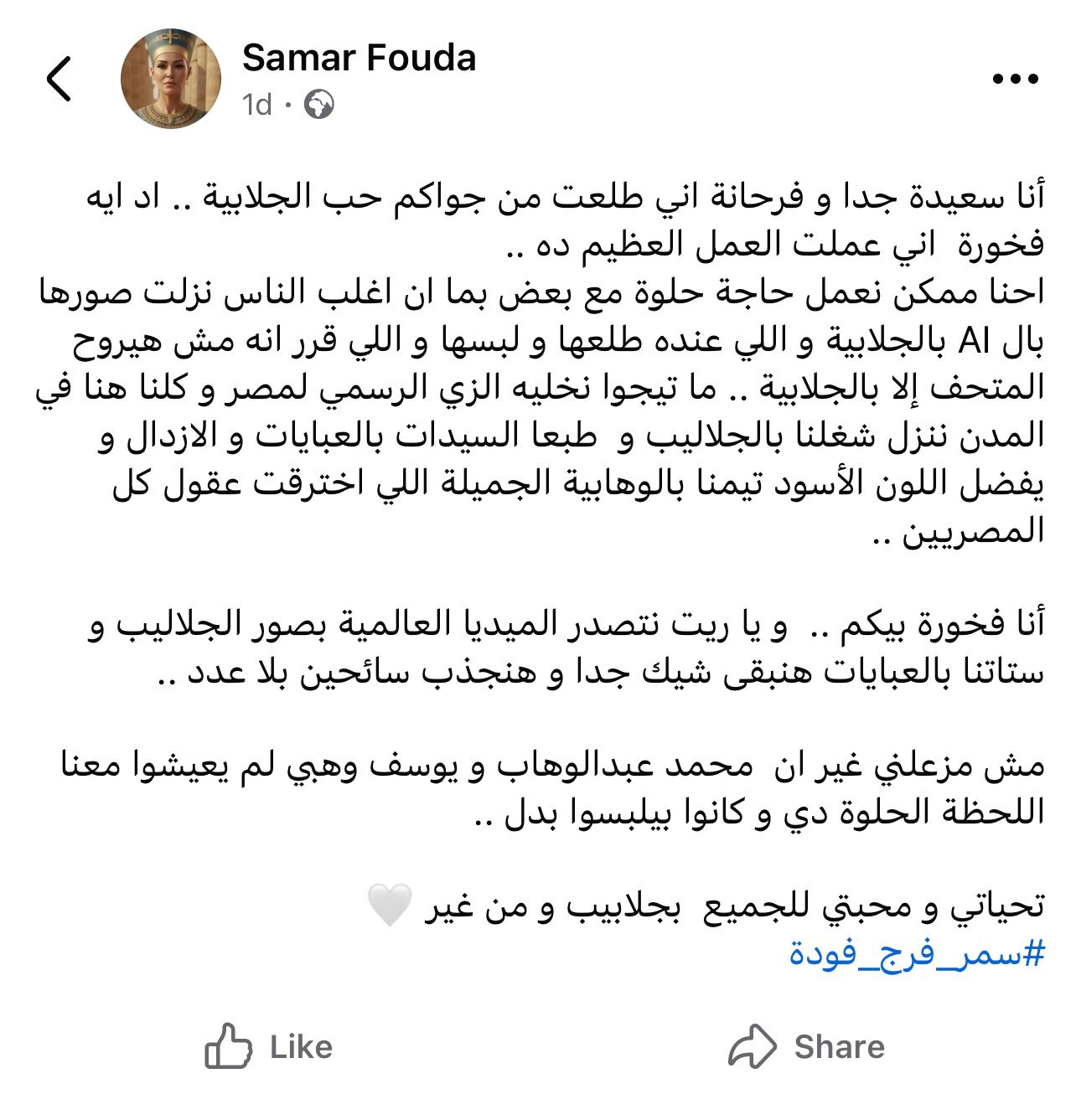 وكانت سمر فودة في وقت سابق، انتقدت ظهور رجل مرتديًا "جلابية"، برفقة زوجته، في المتحف المصري الكبير، قائلة: "أحب أؤكد أنهم لا يمثلون مصر جملة وتفصيلًا".