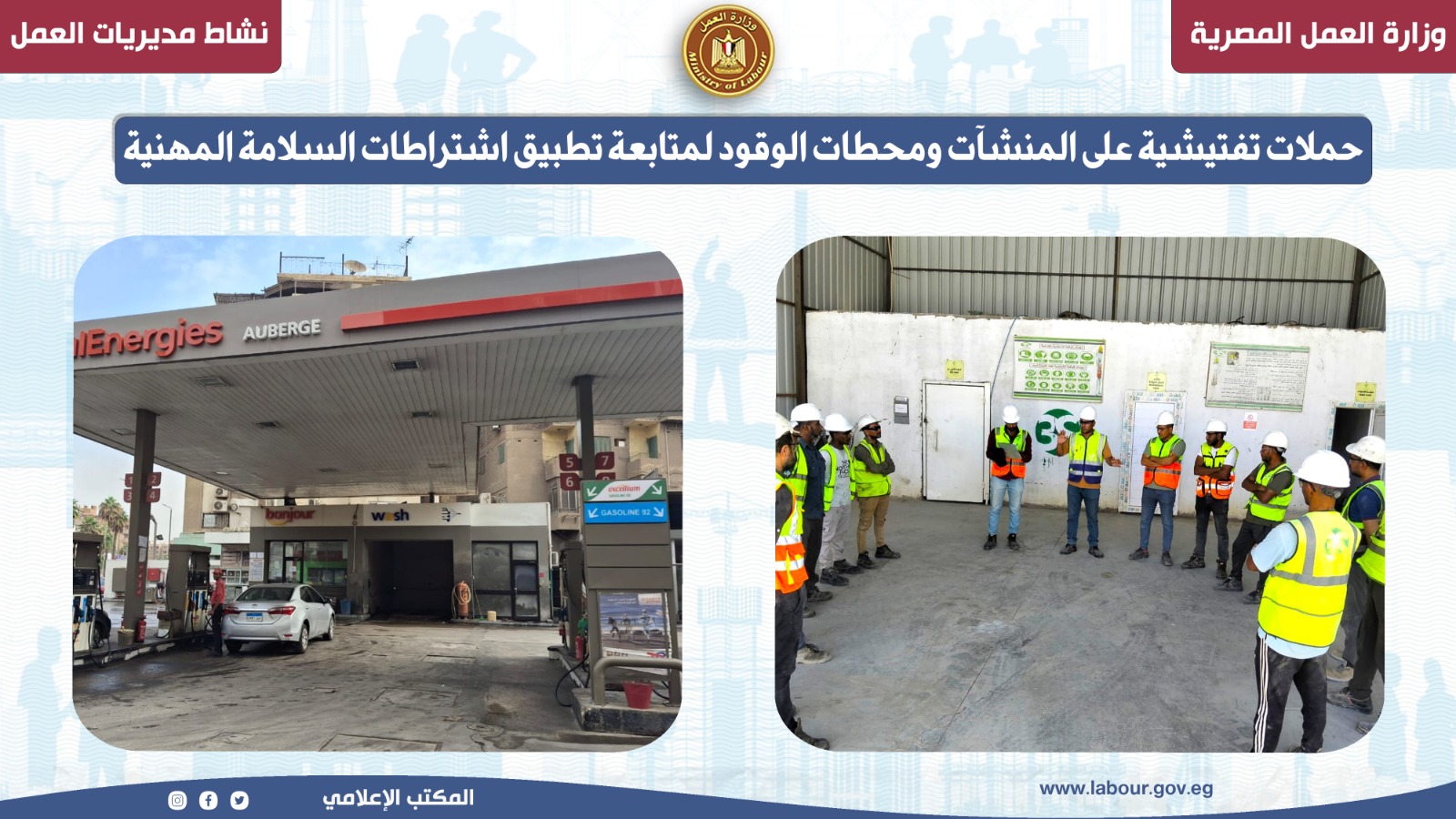 نفذت مديريات عمل الجيزة، و البحر الأحمر،و الوادي الجديد،و مطروح حملات تفتيشية مكثفة على المنشآت ومحطات الوقود بمختلف المدن ، تنفيذًا لتعليمات الوزير محمد جبران وزير العمل، ، حيث استهدفت الحملات التأكد من التزام المنشآت باشتراطات السلامة والصحة المهنية المنصوص عليها في قانون العمل رقم 14 لسنة 2025، إضافة إلى مراجعة تراخيص عمل الأجانب، وتطبيق الحد الأدنى للأجور، والتأكد من وجود عقود عمل للعمال، ضمانًا لتوفير بيئة عمل آمنة ومستقرة.