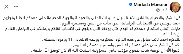 وقال منصور في منشور عبر صفحته الرسمية على «فيسبوك»: «كل الشكر والاحترام لأهلنا رجال وسيدات الدقي والعجوزة والجيزة المحترمين على دعمكم لنجلي أحمد مرتضى في الانتخابات البرلمانية،ما زلت أتمنى استمرار دعمكم له اليوم حتى يوفقه الله وينجح في اكتساب ثقتكم من جديد».