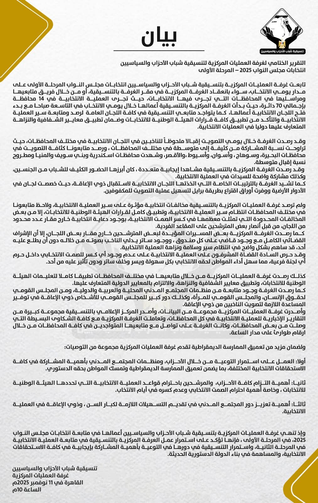 وإذ تنهي غرفة العمليات المركزية بتنسيقية شباب الأحزاب والسياسيين أعمالها في متابعة انتخابات مجلس النواب ٢٠٢٥، في المرحلة الأولى ، فإنها تؤكد على استمرار عمل العرفة المركزية بالتنسيقية في متابعة العملية الانتخابية في المرحلة الثانية، واستمرار التنسيقية في دورها في التوعية بأهمية المشاركة بإيجابية في كافة الاستحقاقات الانتخابية، والمساهمة في بناء الدولة الدستورية الحديثة.