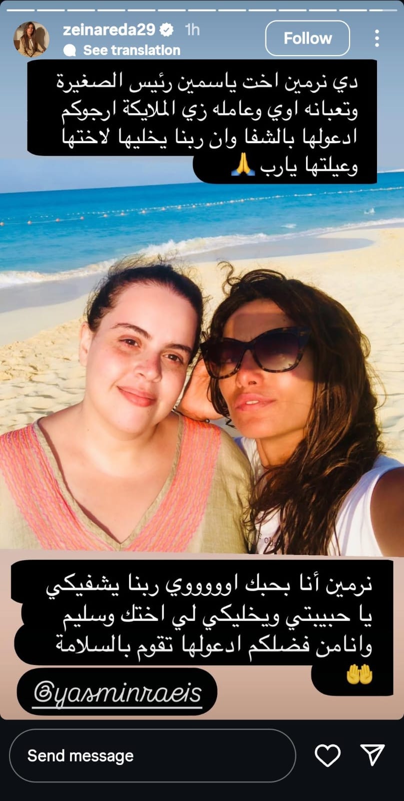 ونشرت زينة، صوره تجمعها بشقيقة ياسمين رئيس، عبر خاصية الاستوري بحسابها الرسمي بموقع "إنستجرام"، قائلة: "دي نرمين أخت ياسمين رئيس الصغيرة وتعبانه أوي وعامله زي الملايكة أرجوكم أدعولها بالشفا وان ربنا يخليها لأختها وعيلتها يارب".