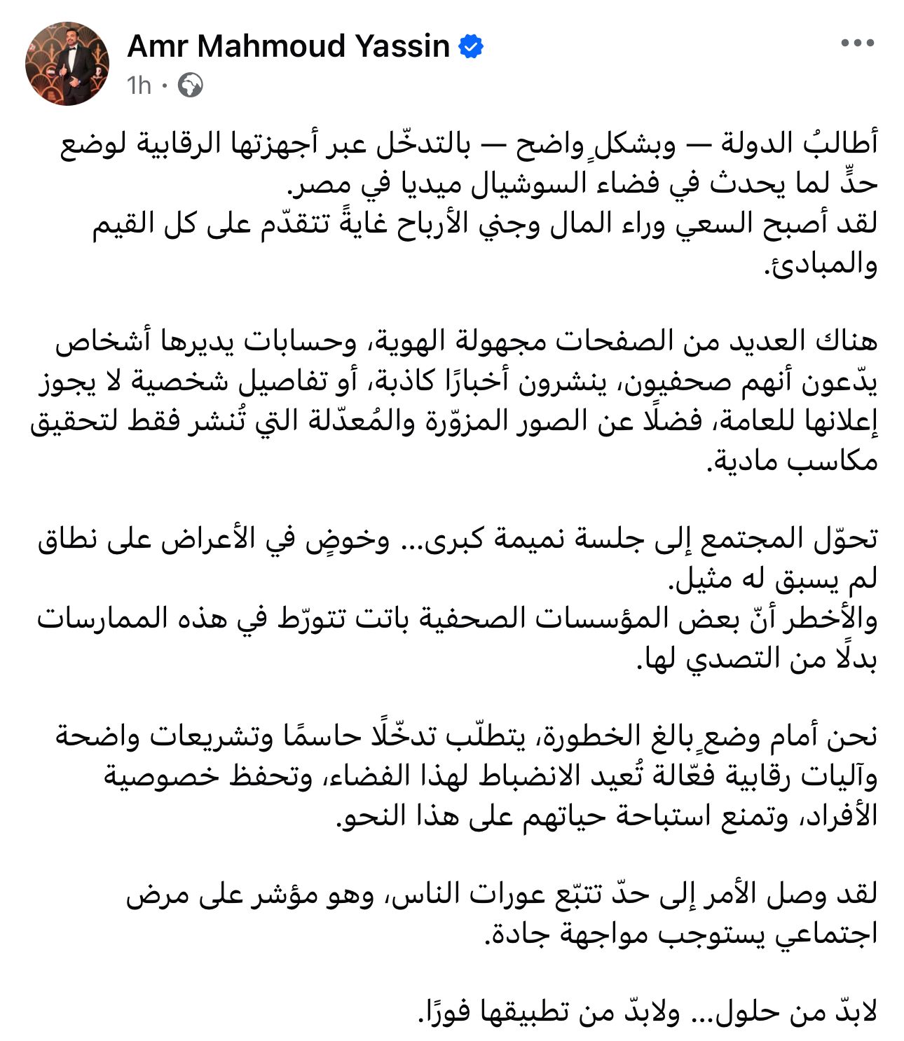 وكتب عمرو محمود ياسين عبر صفحته الشخصية"فيسبوك"، : أطالبُ الدولة وبشكلٍ واضح بالتدخّل عبر أجهزتها الرقابية لوضع حدٍّ لما يحدث في فضاء السوشيال ميديا في مصر، لقد أصبح السعي وراء المال وجني الأرباح غايةً تتقدّم على كل القيم والمبادئ".