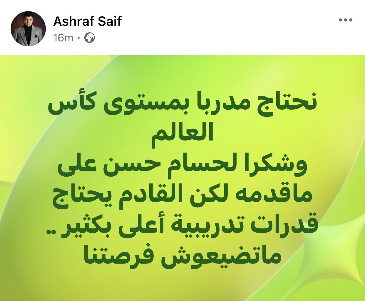 وقال أشرف سيف عبر حسابه الشخصي بموقع فيسبوك: "نحتاج مدربًا بمستوى كأس العالم. وشكرًا لحسام حسن على ما قدمه، لكن القادم يحتاج قدرات تدريبية أعلى بكثير. ماتضيعوش فرصتنا".