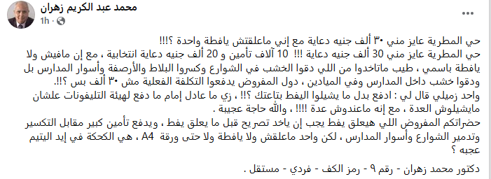 وأكد المرشح في منشور عبر صفحته الرسمية أن الأمر غريب للغاية، خاصة أن هناك آخرين قاموا بتكسير الأرصفة والأسوار ودق الخشب في المدارس والشوارع ولم يُطلب منهم دفع أي تكاليف، لماذا يتم مطالبة من لم يعلق أي يافطة بهذا المبلغ؟.