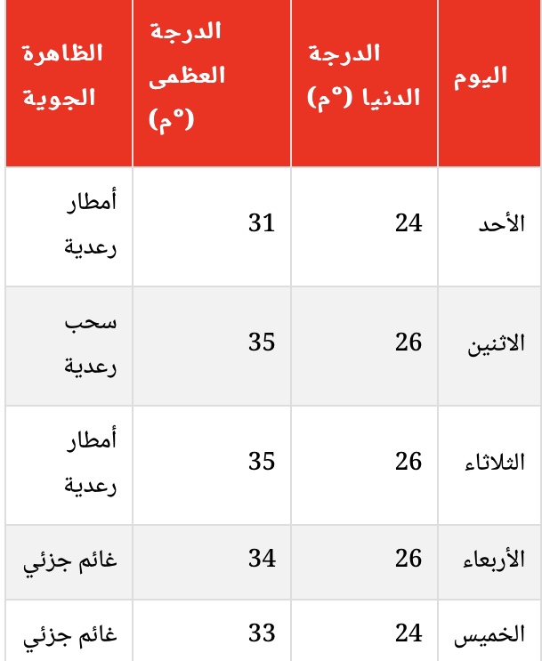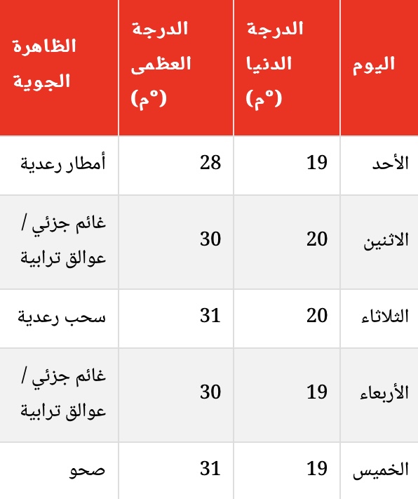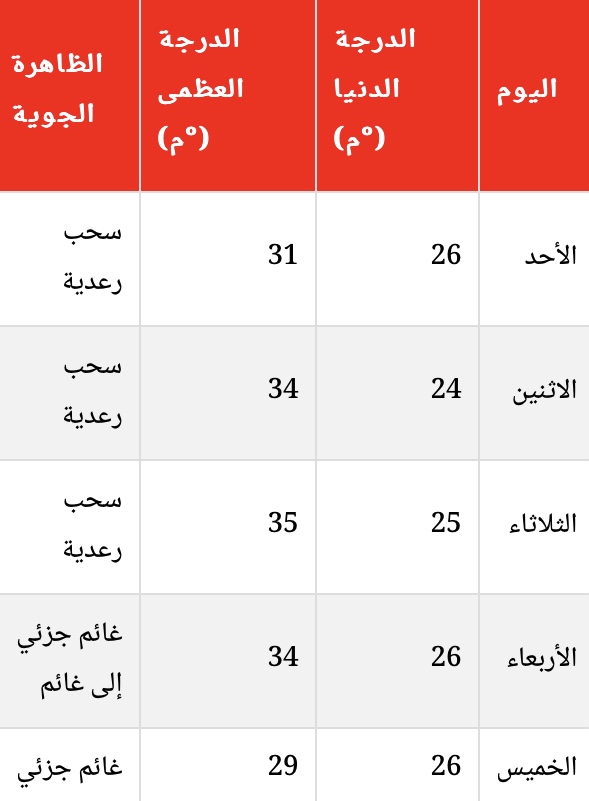 وتتوقع الأرصاد أن تتراوح درجات الحرارة بين 24 و30 درجة مئوية، مع رياح تتحول ليلًا إلى شمالية شرقية بسرعة تتراوح بين 10 و42 كم/ساعة، بالإضافة إلى احتمالات لسقوط أمطار متوسطة إلى غزيرة.
