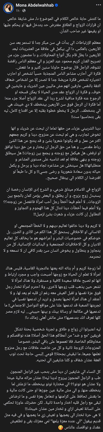 وكتبت منى عبدالوهاب عبر صفحتها الشخصية "فيسبوك" ما كنتش حابة خالص الكلام في الموضوع دا، مش شايفه خالص ان قرارات الزواج والطلاق مفترض حد يتدخل فيها او يحكم عليها او يقيمها غير صاحب الشأن."