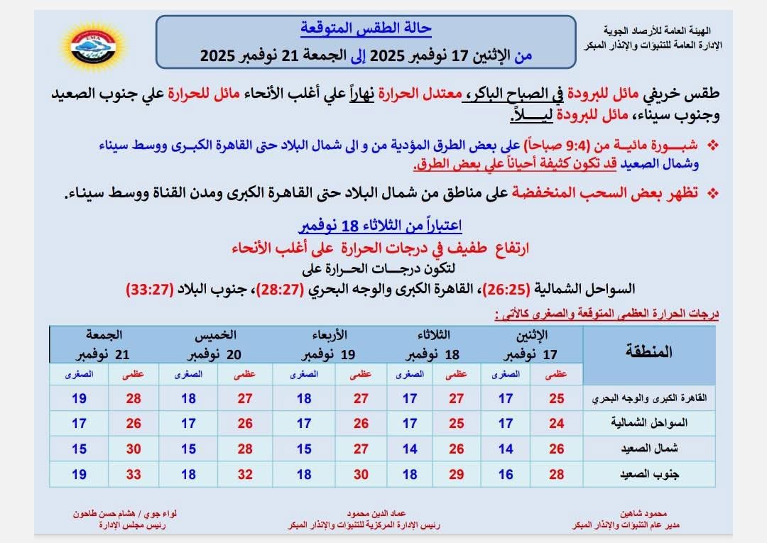 وتشير التنبؤات إلى أن أعلى درجات الحرارة ستكون في جنوب الصعيد يوم الجمعة 21 نوفمبر، مع استمرار الطقس الدافئ نسبيًا في ساعات النهار، بينما يسود الطقس البارد في الساعات المبكرة من الصباح وفي الليل.