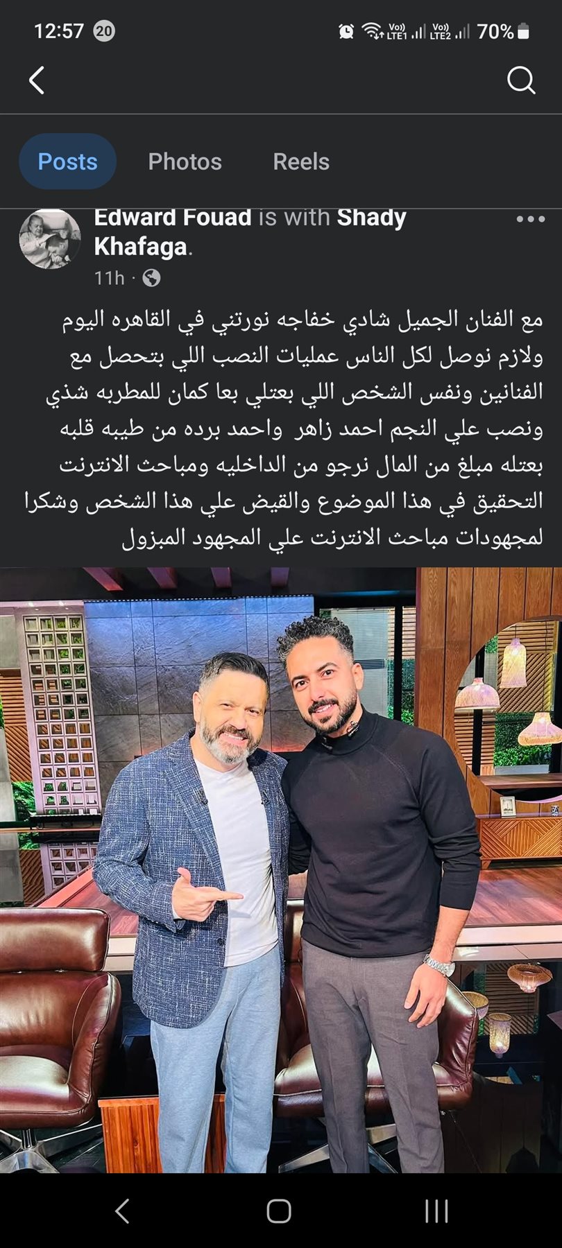وكتب قائلا: “إنه التقى بالفنان شادي خفاجة في القاهرة، وأكد أهمية توعية الجمهور حول عمليات النصب التي تستهدف الفنانين”.