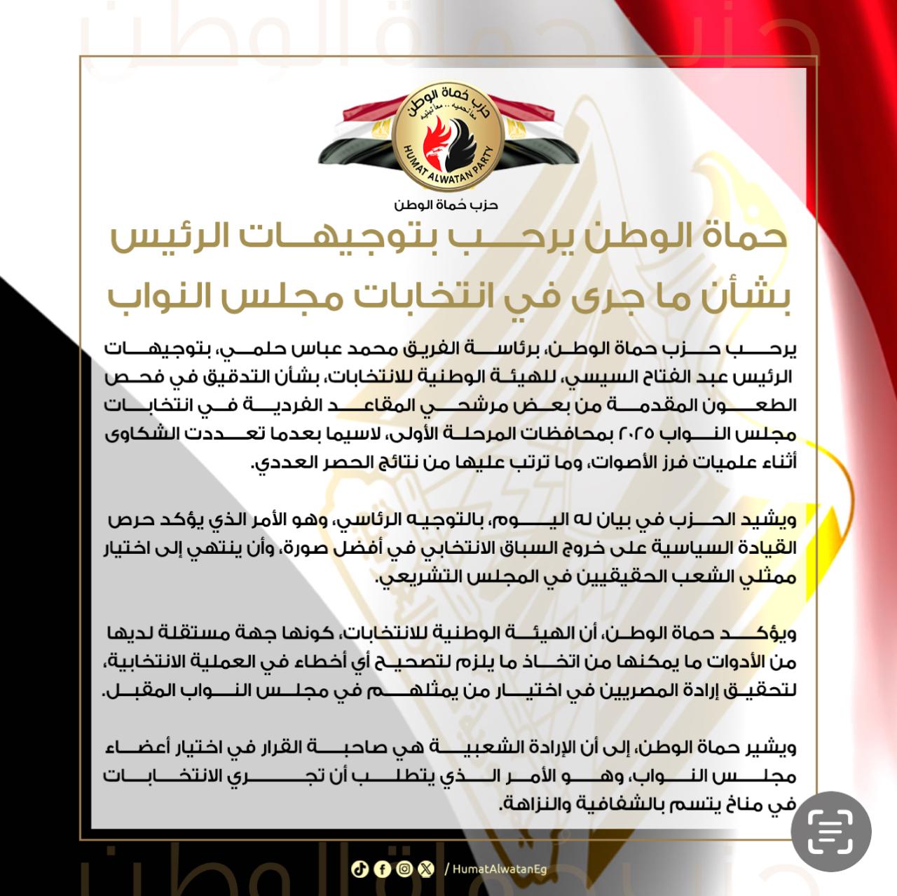 رحب حزب حماة الوطن، برئاسة الفريق محمد عباس حلمي، بتوجيهات الرئيس عبد الفتاح السيسي للهيئة الوطنية للانتخابات بشأن التدقيق في فحص الطعون المقدمة من بعض مرشحي المقاعد الفردية في انتخابات مجلس النواب 2025 بمحافظات المرحلة الأولى، خاصة بعد تعدد الشكاوى خلال عمليات فرز الأصوات وما ترتب عليها من نتائج الحصر العددي.