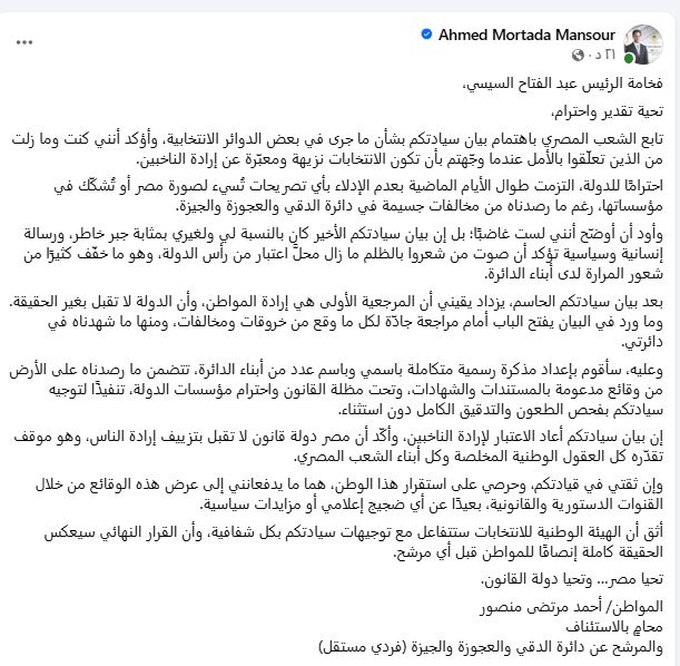 وقال منصور في بيان رسمي: "كنت وما زلت من أصحاب الأمل منذ توجيه الرئيس بأن تكون الانتخابات نزيهة ومعبّرة عن الإرادة الحقيقية للمواطنين، ولهذا التزمت طوال الأيام الماضية بعدم الإدلاء بأي تصريحات قد تسيء لصورة الدولة أو تشكّك في مؤسساتها، رغم ما رصدناه من مخالفات جسيمة في دائرة الدقي والعجوزة والجيزة."