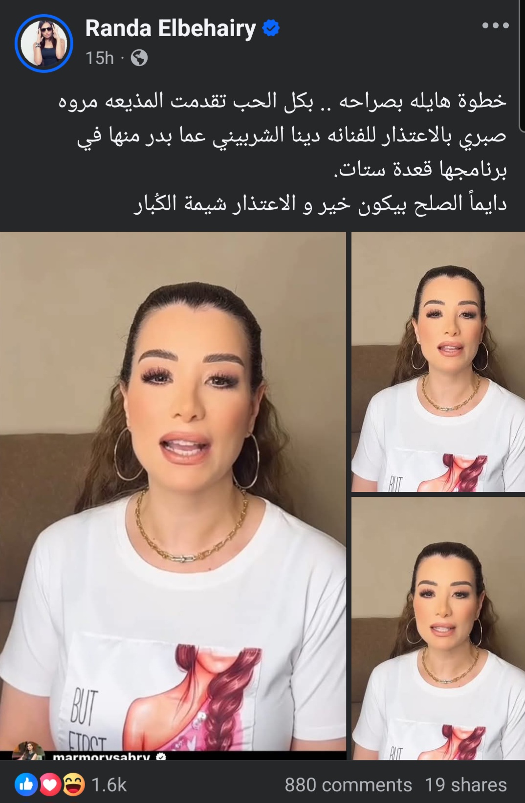 علقت الفنانة راندا البحيري، على تصرف مروة صبري، حيث اعتذرت في مقطع فيديو عما بدر منها للفنانة دينا الشربيني.