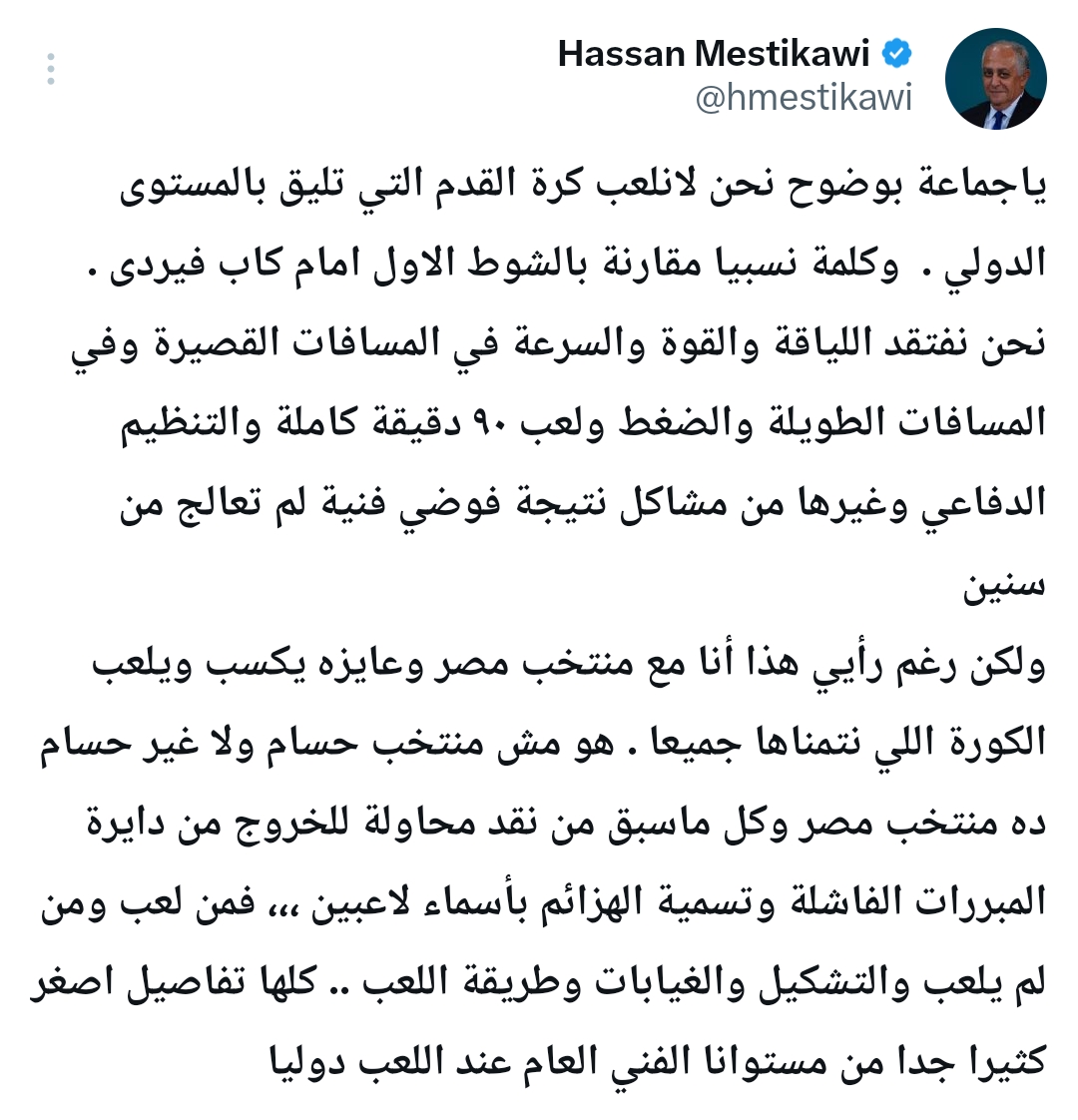 وكتب المستكاوي عبر حسابه على موقع "إكس": "يا جماعة بوضوح، نحن لا نلعب كرة القدم التي تليق بالمستوى الدولي".