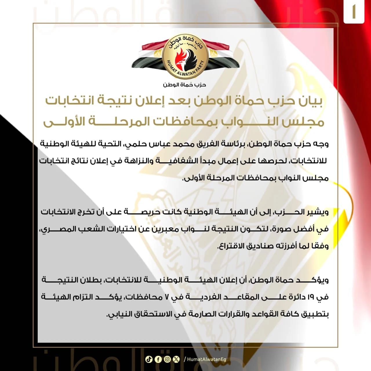 وجه حزب حماة الوطن، برئاسة الفريق محمد عباس حلمي، التحية للهيئة الوطنية للانتخابات، لحرصها على إعمال مبدأ الشفافية والنزاهة في إعلان نتائج انتخابات مجلس النواب بمحافظات المرحلة الأولى.