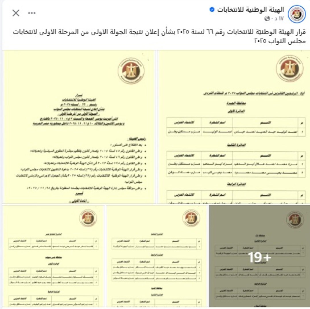 في واقعة أثارت جدلًا واسعًا بين المتابعين، نشرت الهيئة الوطنية للانتخابات مساء اليوم الثلاثاء، نتيجة غير دقيقة عبر صفحتها الرسمية على موقع «فيس بوك»، قبل أن تتدارك الأمر سريعًا وتحذفها بعد دقائق قليلة من نشرها.