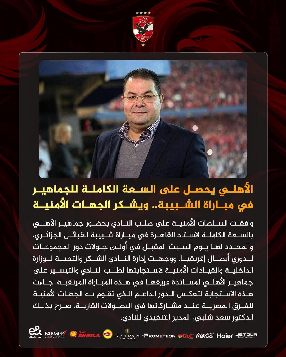 وأكد سعد شلبي المدير التنفيذي للنادي في بيان رسمي، أن:"السلطات الأمنية وافقت على طلب النادي بحضور الجماهير بالكامل في مباراة شبيبة القبائل، ونحن نتوجه بالشكر لوزارة الداخلية والقيادات الأمنية لتعاونهم وتيسير حضور الجماهير لمساندة الفريق".