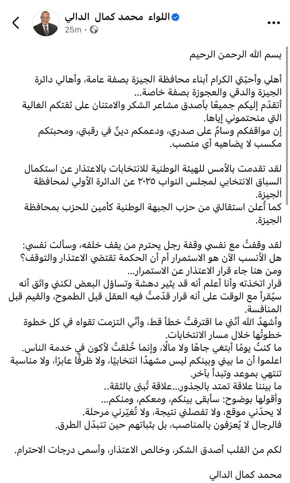 لقد تقدمت بالأمس للهيئة الوطنية للانتخابات بالاعتذار عن استكمال السباق الانتخابي لمجلس النواب ٢٠٢٥ عن الدائرة الأولي لمحافظة الجيزة.