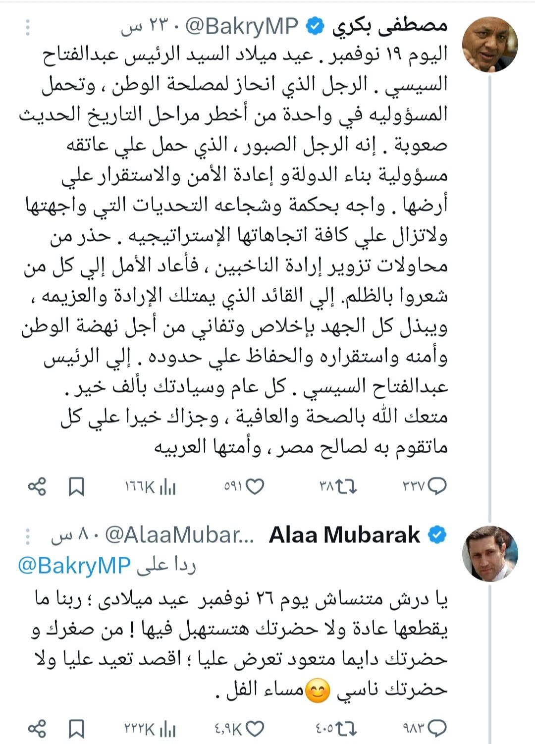 الجدال والمشادات بين مصطفى بكرى وعلاء مبارك، متكررة على وسائل التواصل الاجتماعى، غير أن تلك المشاحنات تطورت أمس على خلفية رسالة تهنئة وجهها بكرى للرئيس السيسي بعيد ميلاده.