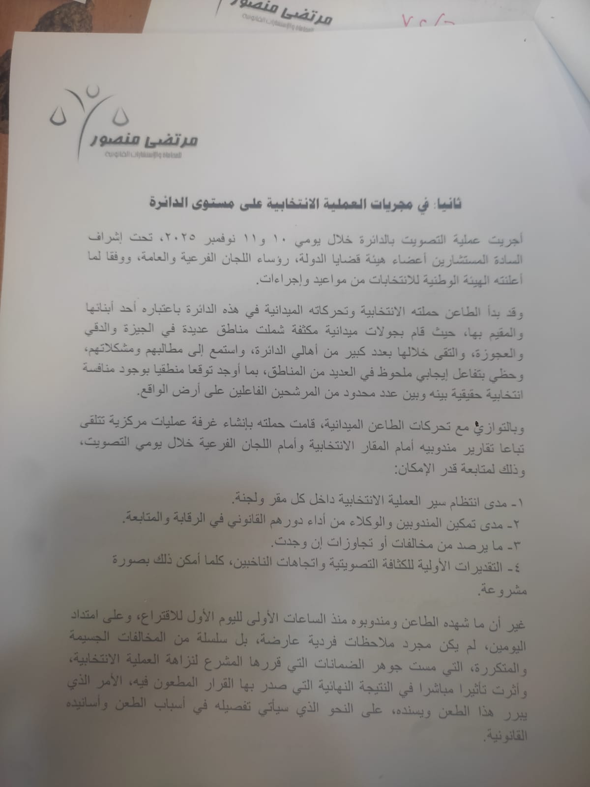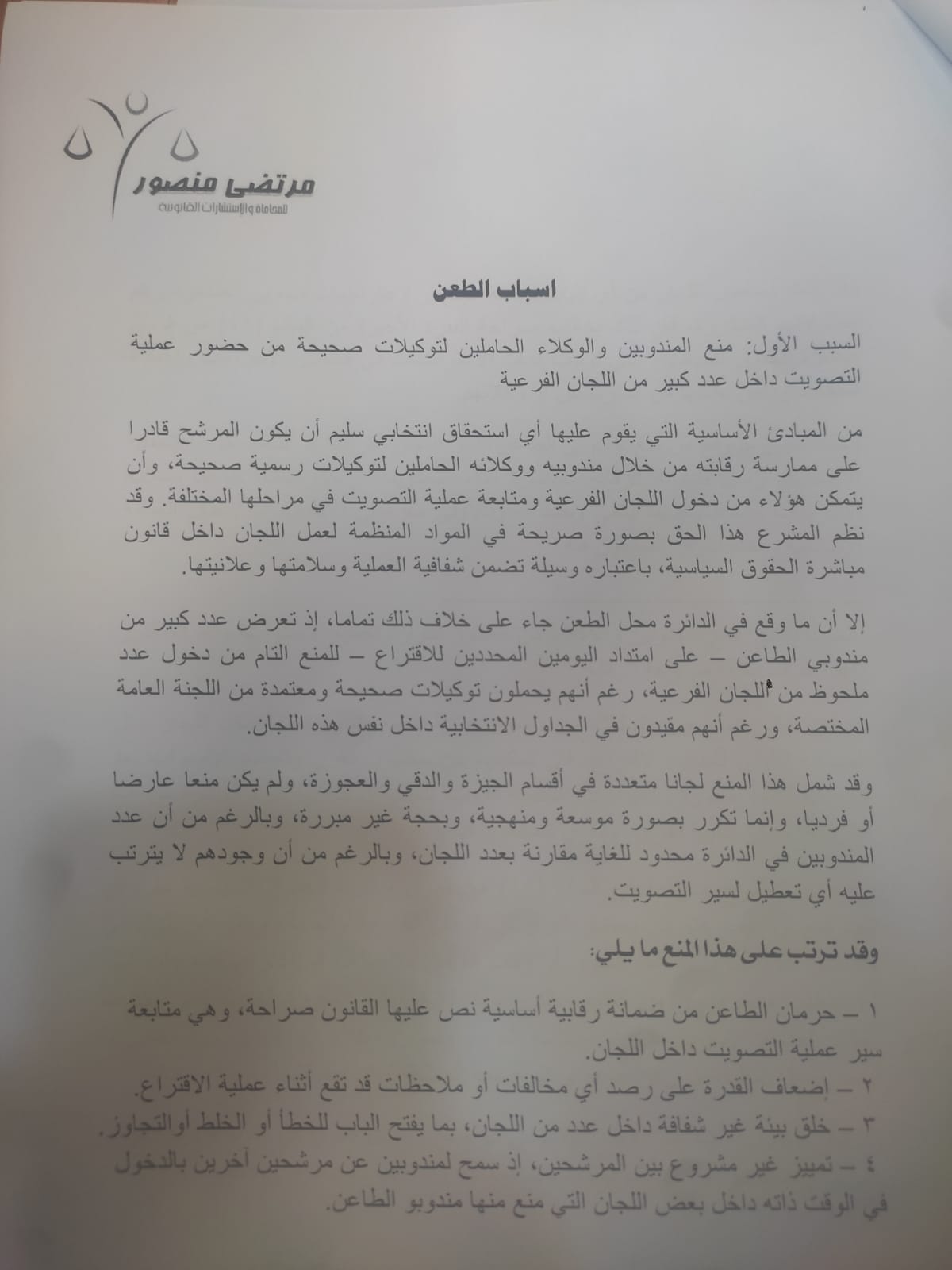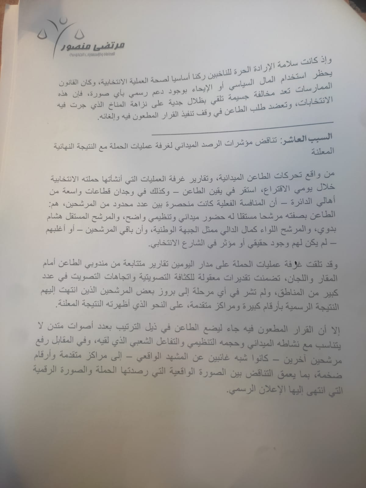 ويطالب الطعن بمراجعة النتائج واتخاذ الإجراءات القانونية اللازمة، بما في ذلك إعادة الفرز أو إعادة الانتخابات في حال ثبوت مخالفات جوهرية أثرت على نزاهة العملية الانتخابية.
