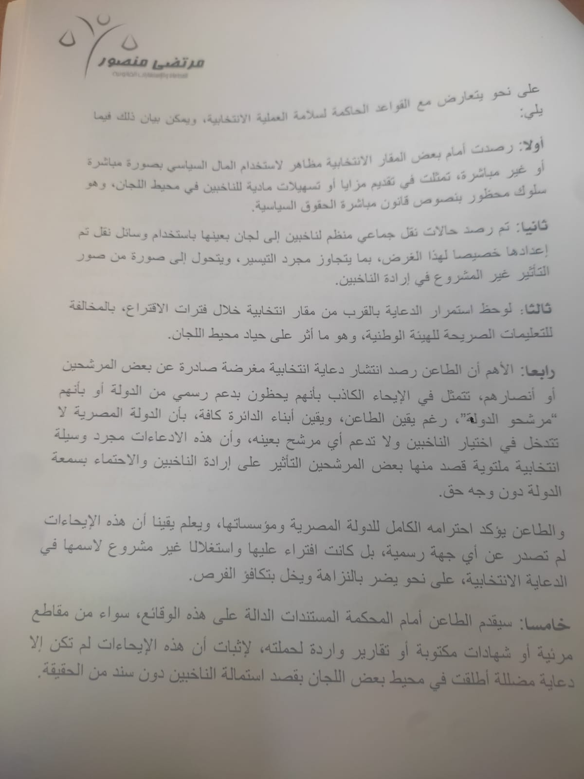 وأكد أحمد مرتضى أن اللجوء إلى القضاء يعكس احترامه للقانون وثقته في نزاهة القضاء المصري، مشيرًا إلى أن البيان الأخير للرئيس عبد الفتاح السيسي حول أهمية الحفاظ على حقوق المواطنين وضمان شفافية الانتخابات كان دافعًا إضافيًا لاتخاذ هذه الخطوة.