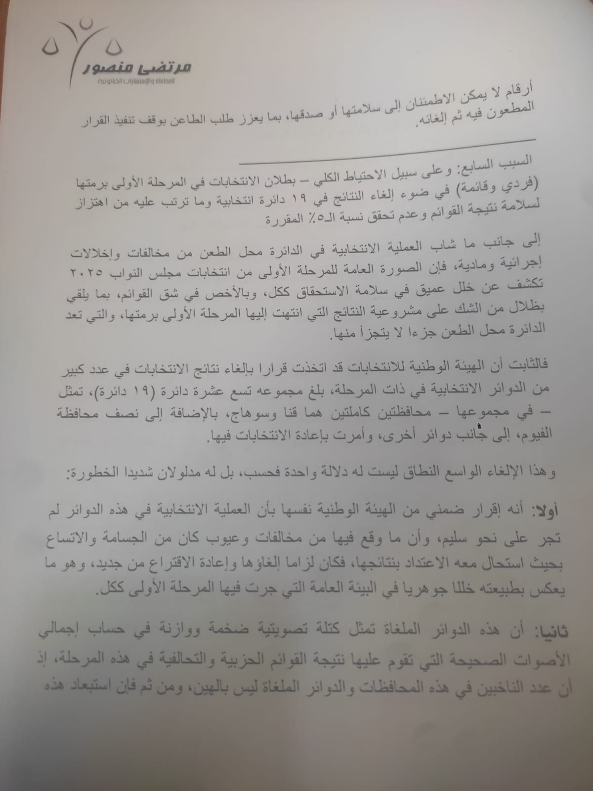بالإضافة إلى تأكيد الطعن على بطلان الانتخابات في 19 دائرة انتخابية نتيجة المخالفات الجوهرية التي شابت عملية التصويت والفرز، مؤكدًا أن هذه المخالفات أثرت بشكل مباشر على مصداقية النتائج النهائية.
