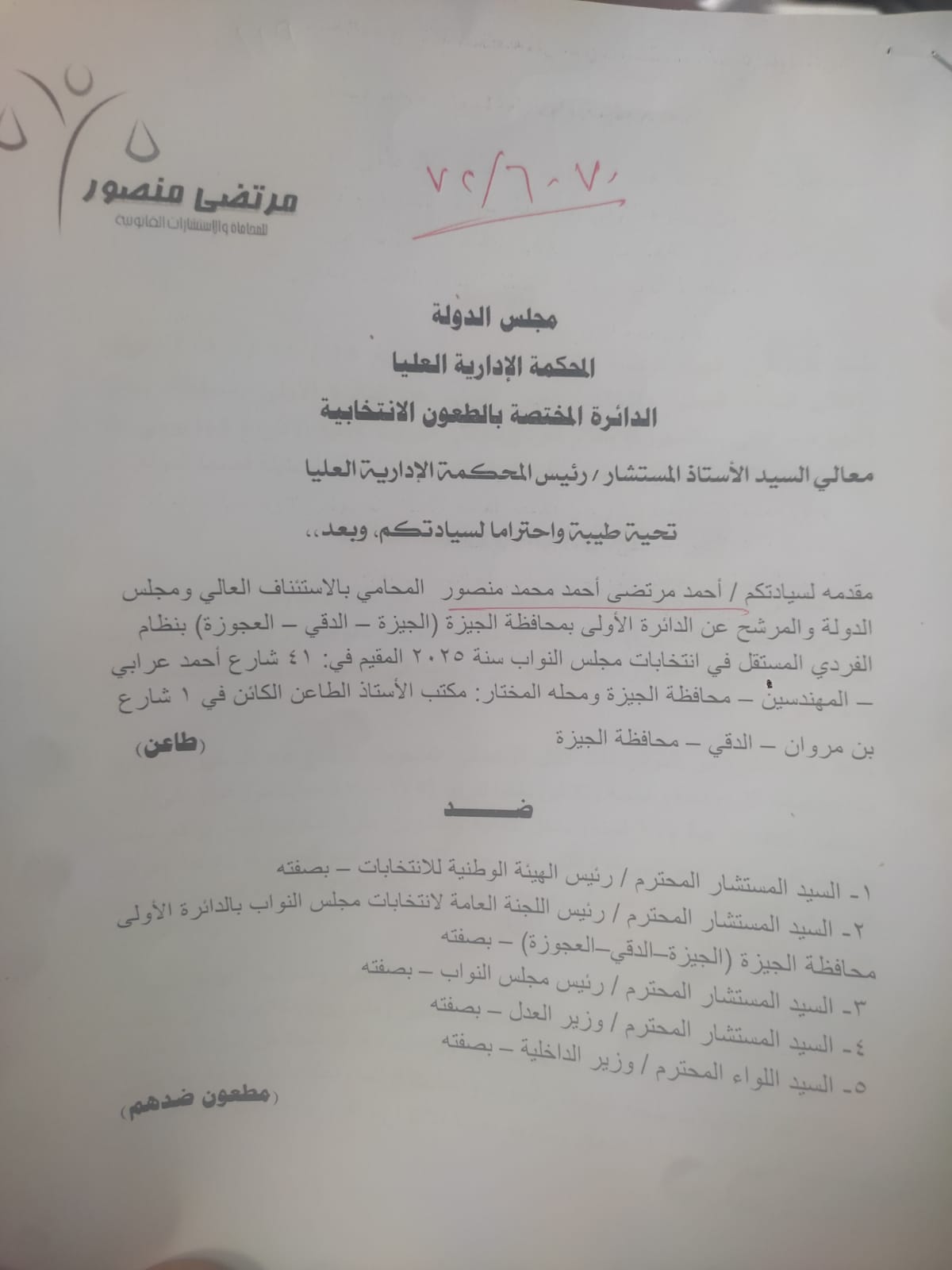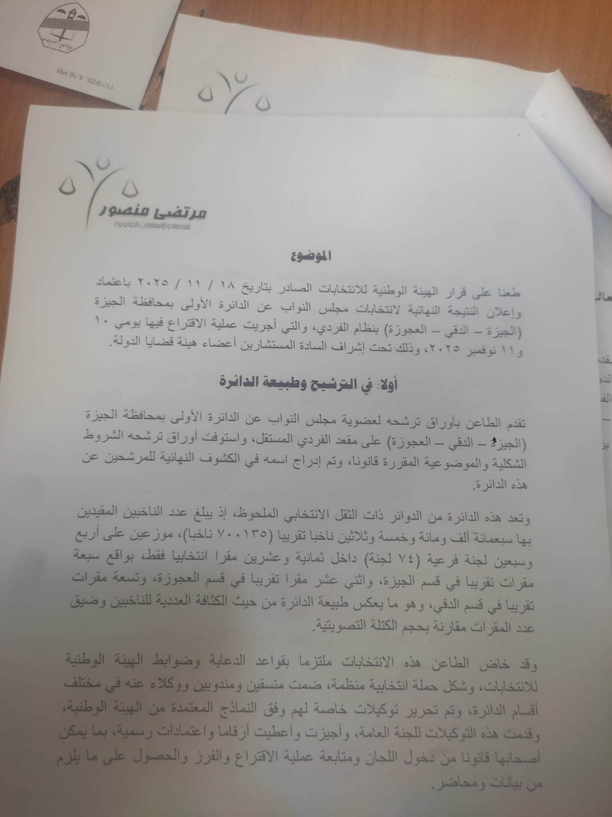 قدم أحمد مرتضى منصور، عضو مجلس النواب السابق ومرشح المرحلة الأولى، طعنًا رسميًا أمام المحكمة الإدارية العليا على نتائج الانتخابات في دائرته، وجاء الطعن استنادًا إلى مستندات وتقارير يرى أنها تكشف عن تجاوزات خلال عملية التصويت والفرز.